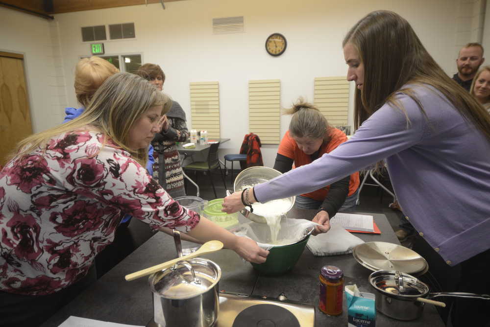 Photo by Kelly Sullivan/ Peninsula Clarion Beth Lyons and Anne McCabe help Amy Lou Pascucci during one of the beginning steps of making Paneer Tuesday, Feb. 10, 2015, at the Kenai Community Library in Kenai, Alaska. Lyons said, in the past, she has visisted the library mainly so she and her children could check out reading materials. More recently she, and she believes the wider community, come for classes such as Pascucci's cheese-making workshop, and as a place to congregate.