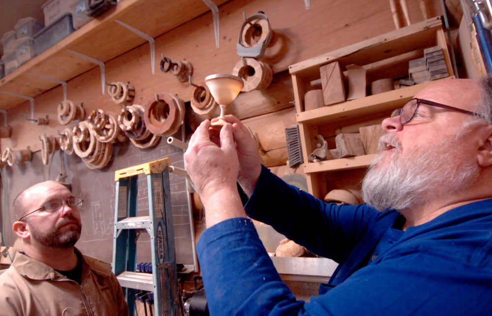 Middle: Lee Halstead (right) examines the thin, translucent bowl of a birch goblet carved by Sterling Rasmussen (left) at a Kenai Peninsula Woodturner’s meeting at the “3 Guys, No Wood” workshop on Saturday.