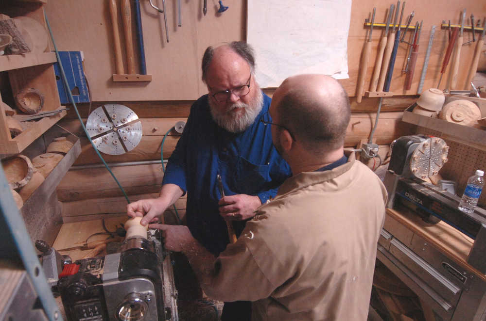 Bottom: Sterling Rasumussen teaches Lee Halstead how to turn a birch goblet on an electric lathe at a Kenai Peninsula Woodturner’s meeting at the “3 Guys, No Wood” workshop on Saturday.