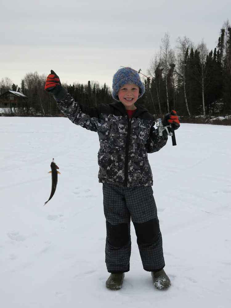 That’s why, on the very next weekend I headed out to join a large group, comprised of those new to the activity as well as many seasoned veterans of the sport. We all gathered last Sunday afternoon on Sport Lake for an event dubbed Ice Fishapalooza. It was sponsored by our local chapter of Trout Unlimited, with extra rods donated for use by the Kenai River Sportfishing Association. With unseasonably warm temperatures and a roaring fire, and with hot dogs and munchies provided by Trout Unlimited, being out on the ice was extremely comfortable. The event was also very well attended. Lisa Beranek, one of the organizers, estimated upwards of 50 people participated at different times throughout the afternoon.