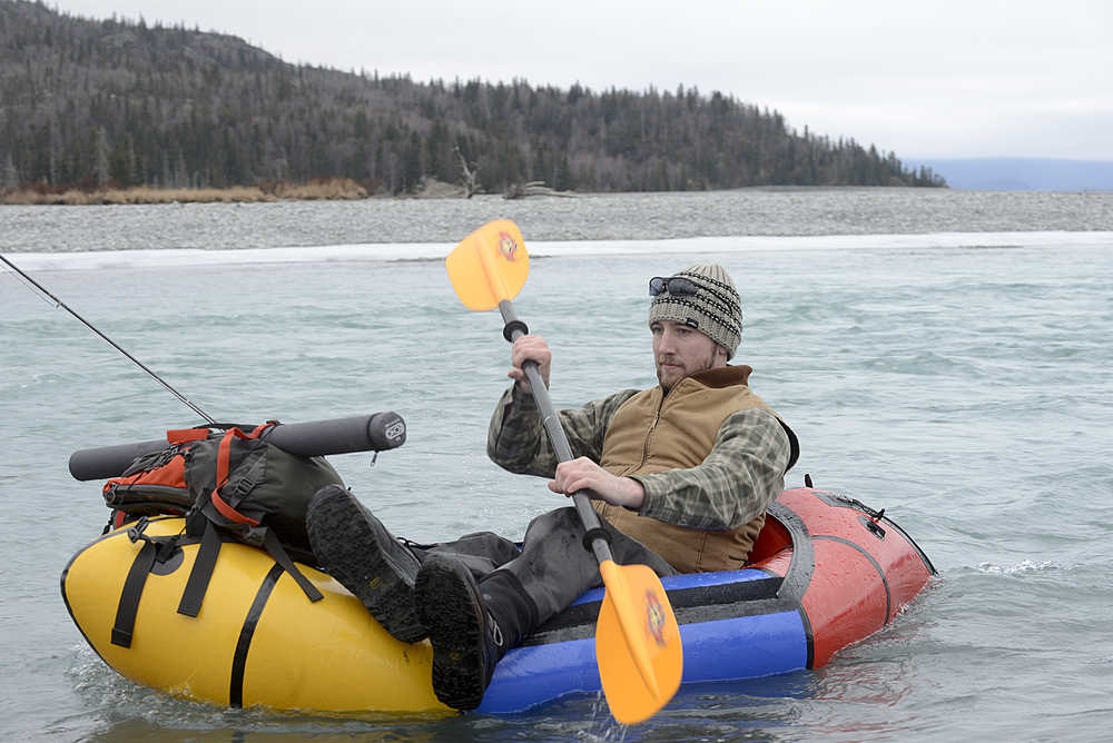 Photo by Rashah McChesney/Peninsula Clarion Thor Lindstam, of Anchorage, manuevers his inflatable raft up to the shore while fishing near Skilak Lake on Sunday March 1, 2015 near Sterling, Alaska. Lindstam said he didn't have much luck trout fishing but had caught, and released, a silver salmon.