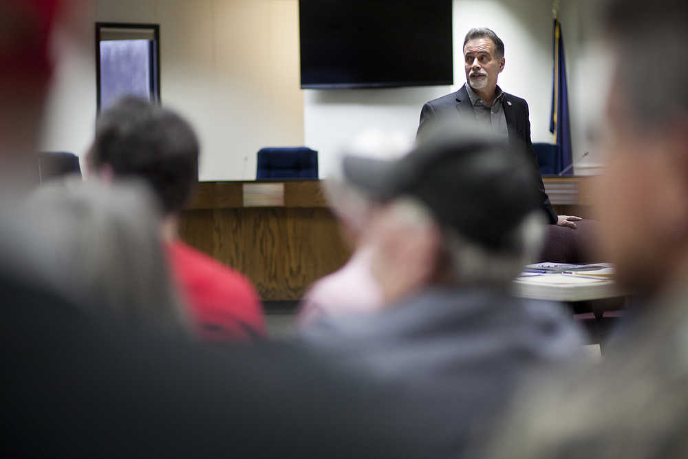 Senator Peter Micciche, R-Soldotna, began his town hall meeting on Friday evening in Soldotna’s borough assembly chamber by speaking on Alaska’s reduced state budget.