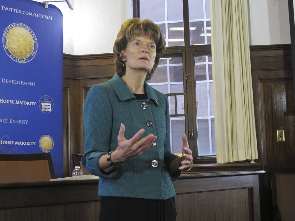 U.S. Sen. Lisa Murkowski, R-Alaska, speaks with reporters after delivering an address to a joint session of the state Legislature on Wednesday, Feb. 18, 2015, in Juneau, Alaska. (AP Photo/Becky Bohrer)