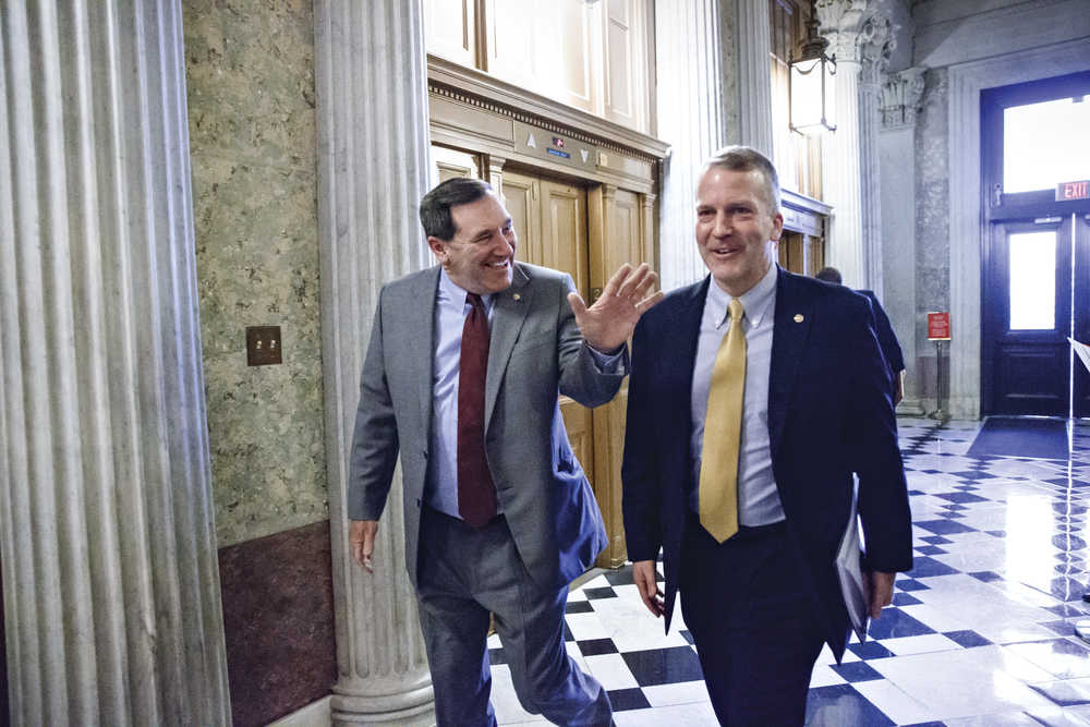 Sen. Joe Donnelly, D-Ind., left, and Sen. Dan Sullivan, R-Alaska, head to the chamber for a procedural vote on a funding bill for the Department of Homeland Security that has produced partisan gridlock in the first several weeks of the new Congress, at the Capitol in Washington, Monday, March 2, 2015. House Republicans want to use the measure to roll back President Obama's executive actions on immigration. Democrats have vowed to block any attempt to compromise on immigration and insist the Congress should approve a "clean" bill funding DHS. (AP Photo/J. Scott Applewhite)