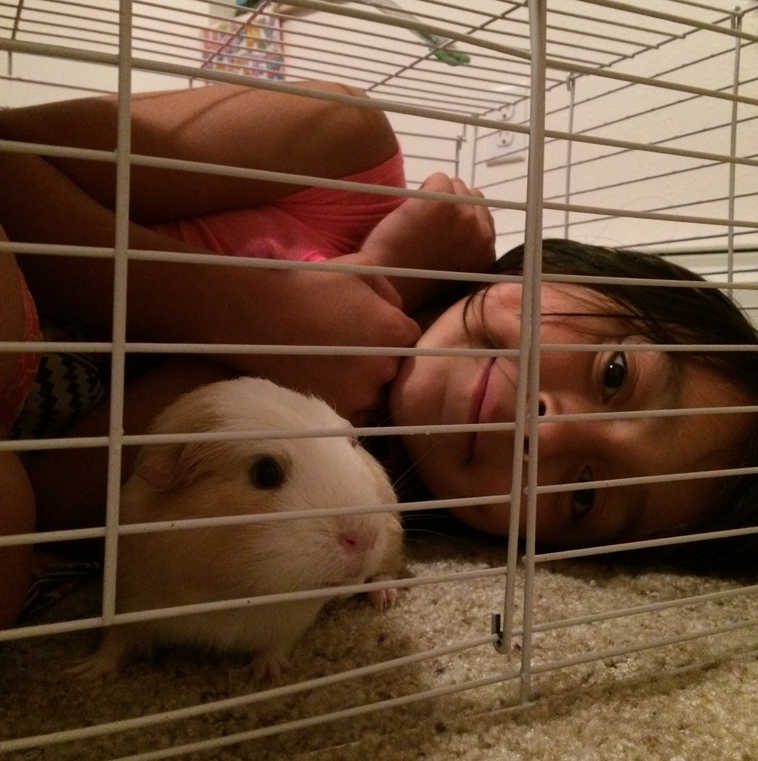 Justeena Silas shared this photo of her daughter, Mya Brown, age 8. Justeena writes, "She could fit in the cage with her guinea pig named Sqeaks! Squeaks is about a 1 year old. They are like best buddies!"