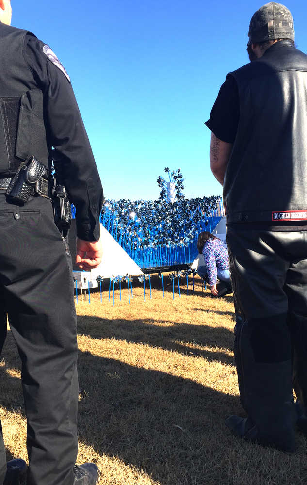 At event, bikers handed out temporary tattoos to children, helped set up the pinwheel stand and planted pinwheels.
