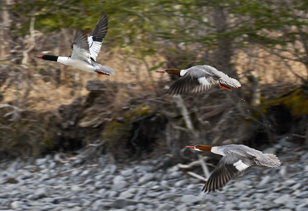 Photo by Rashah McChesney/Peninsula Clarion A flock of common mergansers take flight on Sunday April 5, 2015 on the Kenai River near Cooper Landing, Alaska.