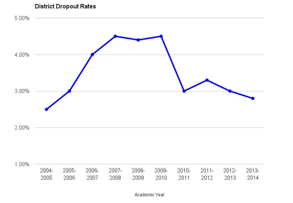 At the end of the 2013-14 school year, 2.8 percent of students in grades 7-12 dropped out district wide, according to the Alaska Department of Education and Early Development. The average between the end of the 2007 and 2010 school years was 4.3 percent.