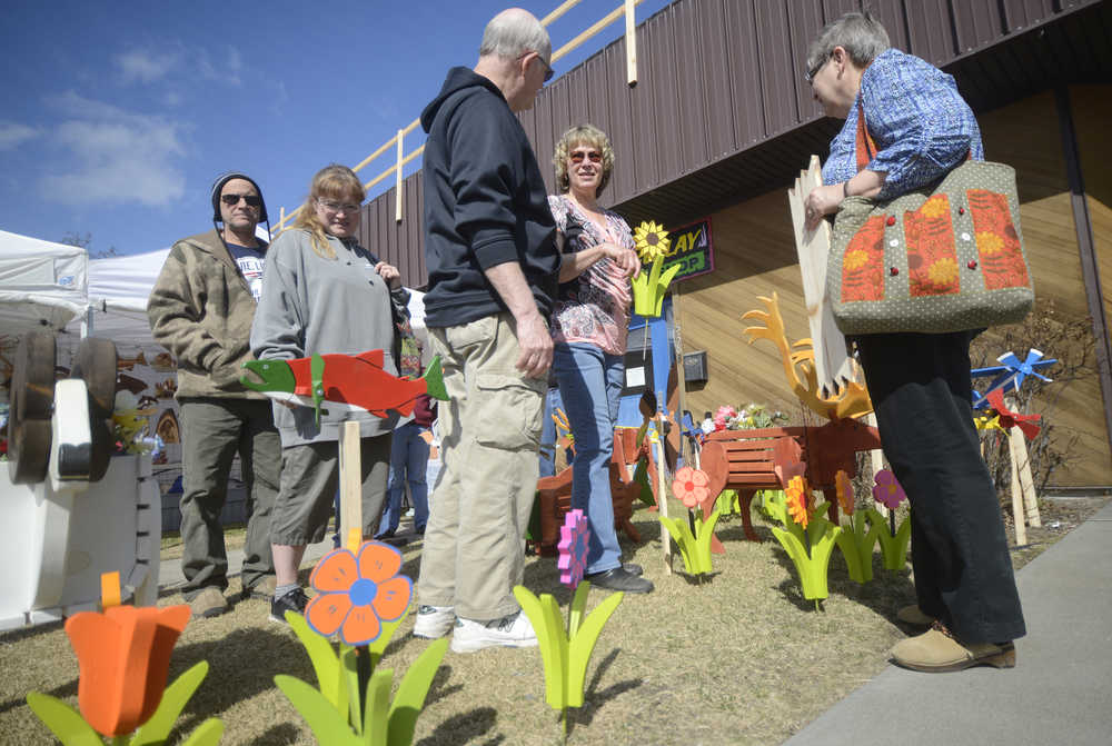 Ben Boettger/Peninsula Clarion Robin Rogers (holding wooden sunflower) displays her crafts at the Kenai Peninsula Sport, Recreation, and Trade Show on Saturday, May 2, at the Soldotna Sports Center.