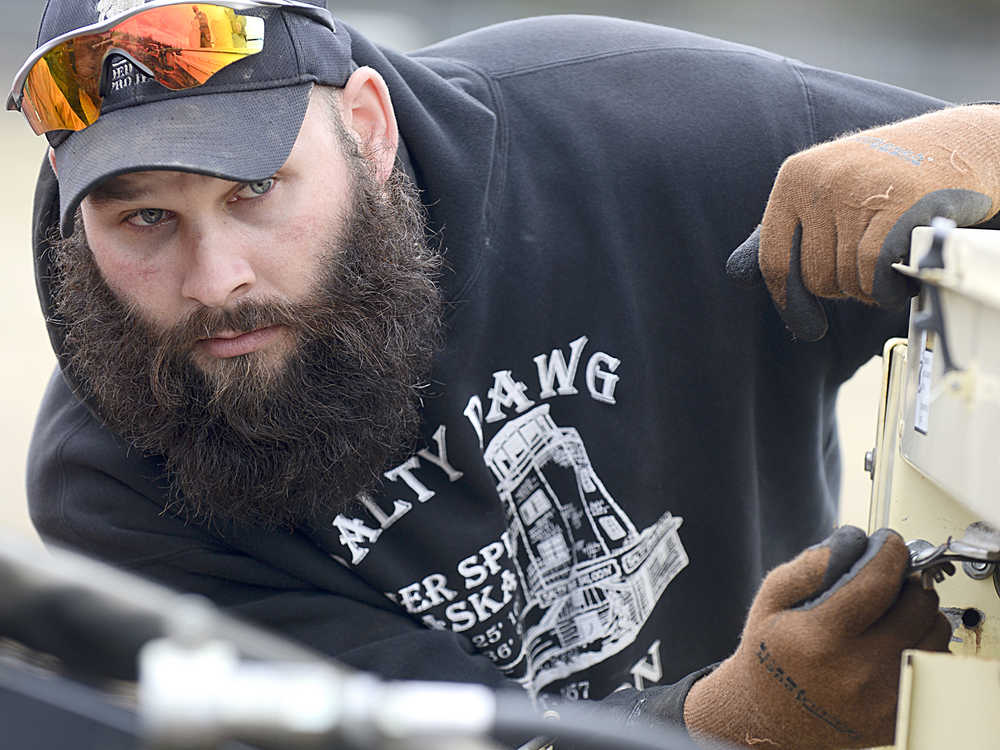 Photo by Rashah McChesney/Peninsula Clarion Matthew Habermann changes the size of a piece on a no-till seed planter to accommodate a smaller seed on Tuesday May 5, 2015 at the rodeo grounds in Soldotna, Alaska. Habermann and several other area farmers took a class required by the Kenai Soil and Water Conservation District, which owns the planter, as a requirement of using the equipment.