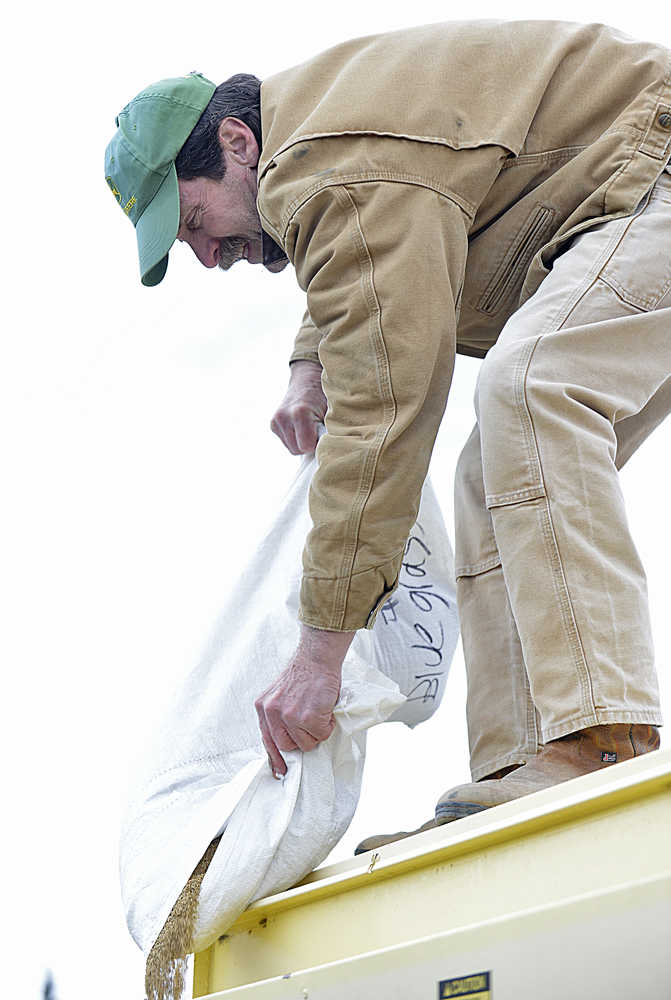 Photo by Rashah McChesney/Peninsula Clarion Larry Marsh pours seed into a no-till seed planter on Tuesday May 5, 2015 at the rodeo grounds in Soldotna, Alaska. The Kenai Soil and Water Conservation District requires that farmers train on certain pieces of its rental equipment before using them. It hosted a training meeting on the seed planter and participants helped to seed a field at the rodeo grounds.