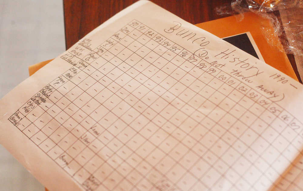 Photo by Kelly Sullivan/ Peninsula Clarion Dee Richards has documented each regular played that has attended the montly 'Bunco' night games Friday, May 1, 2015 in Soldotna, Alaska.