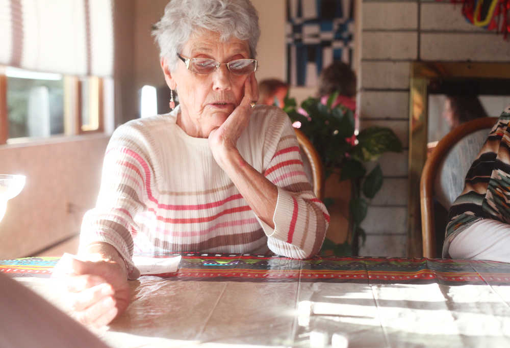 Photo by Kelly Sullivan/ Peninsula Clarion Jan Stenga rolls during her turn in 'Bunco' Friday, May 1, 2015 in Soldotna, Alaska.