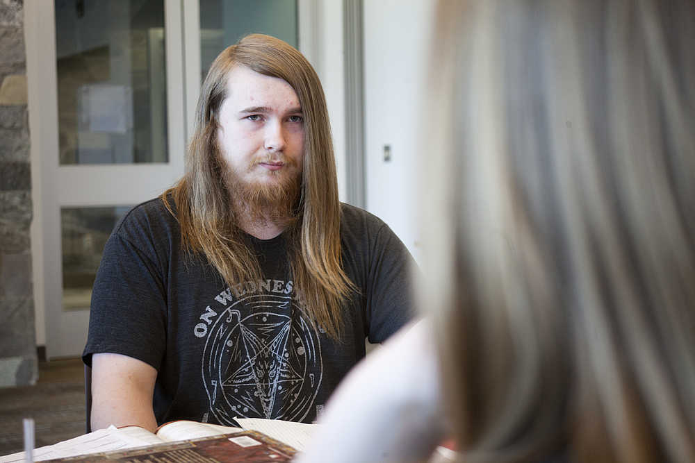 Photo by Rashah McChesney/Peninsula Clarion   (left) Morgan Stoddard laughs as Hans Hesse shows him a character sheet during their Dungeons & Dragons game on April 22, 2015 at the Soldotna Public Library. The group meets regularly at the library and will host a D&D marathon on Saturday for anyone in the community interested in playing the game.