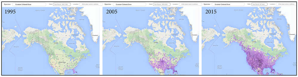 The Eurasian Collared-Dove is native to Asia and Europe. It was accidentally released in 1974 in the Bahamas. It reached Florida sometime in the 1980s. From there it has made a spectacular spread westward and northward across North America, finally reaching Alaska in less than 3 decades. Every citizen science-based project like the Christmas Bird Count and Project Feeder Watch has documented this prolific invasion.