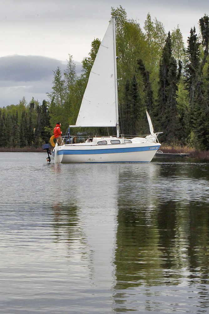 Photo by Rashah McChesney/Peninsula Clarion Brett Vadla slowly pilots his sailboat toward a dock on Sport Lake on Tuesday May 19, 2015 near Soldotna, Alaska.