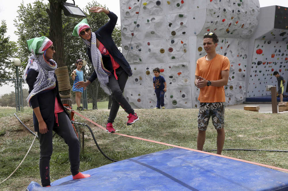 The 22-year-old is one of a growing number of Iranians embracing the extreme sport of slacklining — a high-wire walk on a flat line of webbing strung between rocks or trees up to 60 meters (yards) above the ground. The webbing provides slightly more stability than a round cord, but is also bouncier.