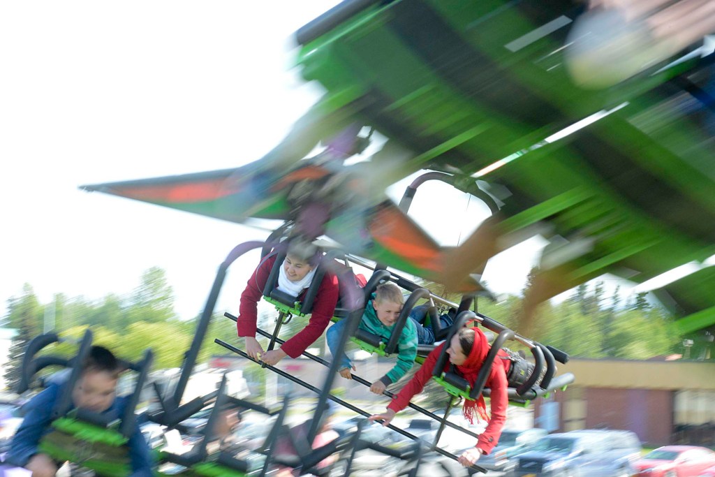 A group laughs while riding the Cliff Hanger on Sunday June 7, 2015 at the Goldwen Wheel Amusements Carnival in Kenai, Alaska.