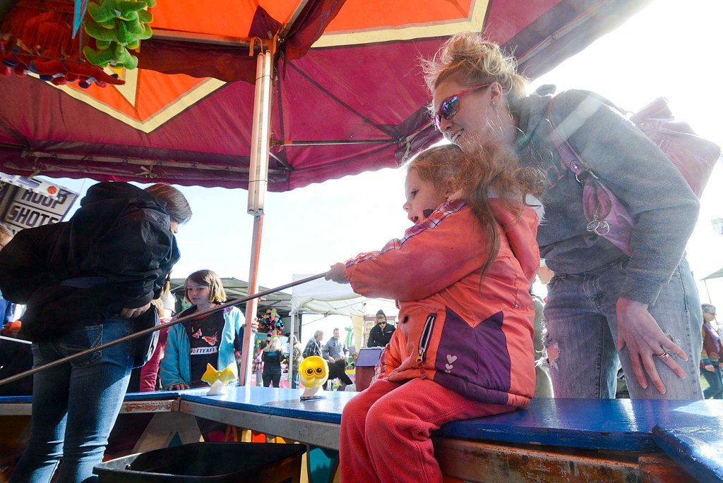 Chloe Jo Sturm, 4, fishes for fake frogs and a prize as her mother Samantha Sturm looks on during the Golden Wheel Amusements Carnival Sunday June 7, 2015 in Kenai, Alaska.