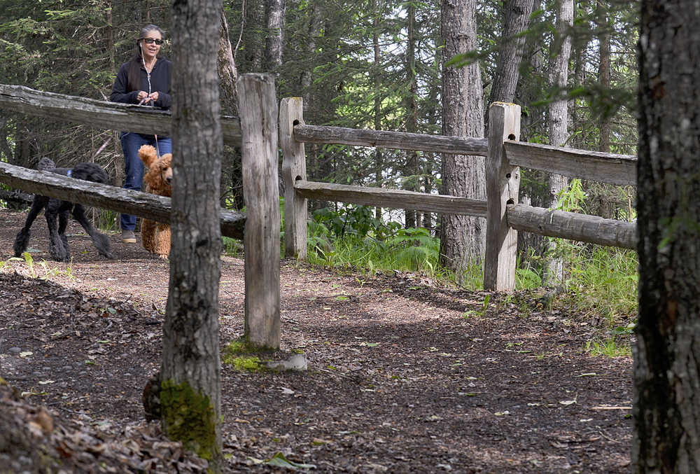 Photo by Rashah McChesney/Peninsula Clarion Charlene Daniels walks her poodles Macy and Rohan at Soldotna Creek Park on Wednesday June 10, 2015 in Soldotna, Alaska.