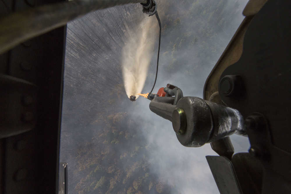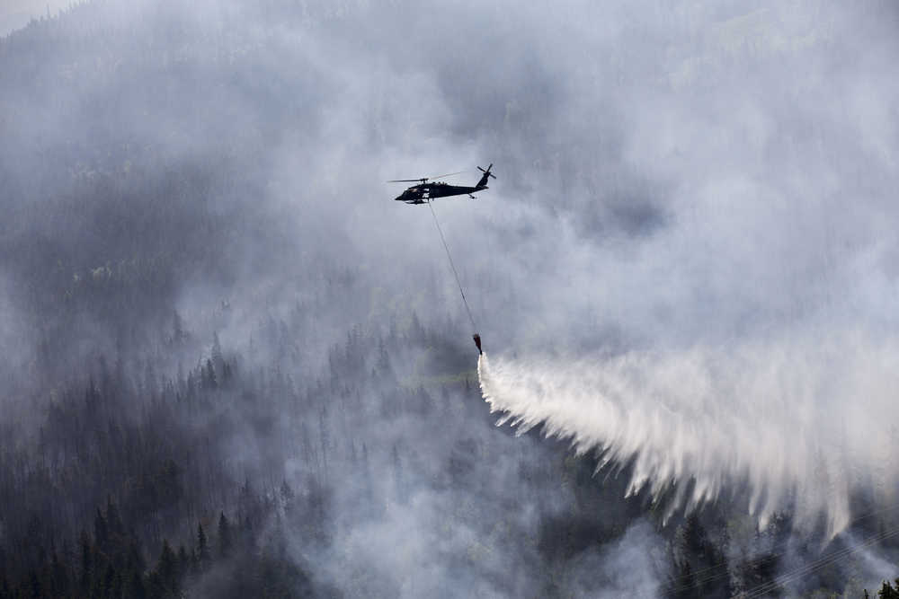 An Alaska Army National Guard UH-60 Black Hawk helicopter from 1st Battalion, 207th Aviation Regiment, drops approximately 700 gallons of water from a "Bambi Bucket" on to the Stetson Creek Fire near Cooper Landing, Alaska, June 17. Two AKARNG Black Hawk helicopters flew a total of 200 bucket missions, dumping more than 144,000 gallons of water on the 300-acre Stetson Creek Fire on the Kenai Peninsula. (U.S. Army National Guard photo by Sgt. Balinda O'Neal)
