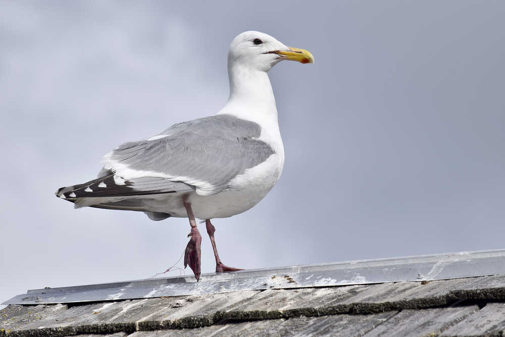 Photo by Rashah McChesney/Peninsula Clarion An off balance seagull watches the Pocaher's Cove neighborhood from the roof of a fish processing shack on Wednesday July 1, 2015 in Kenai, Alaska. The gull has a length of fishing line wrapped around its leg and would not stand on it.