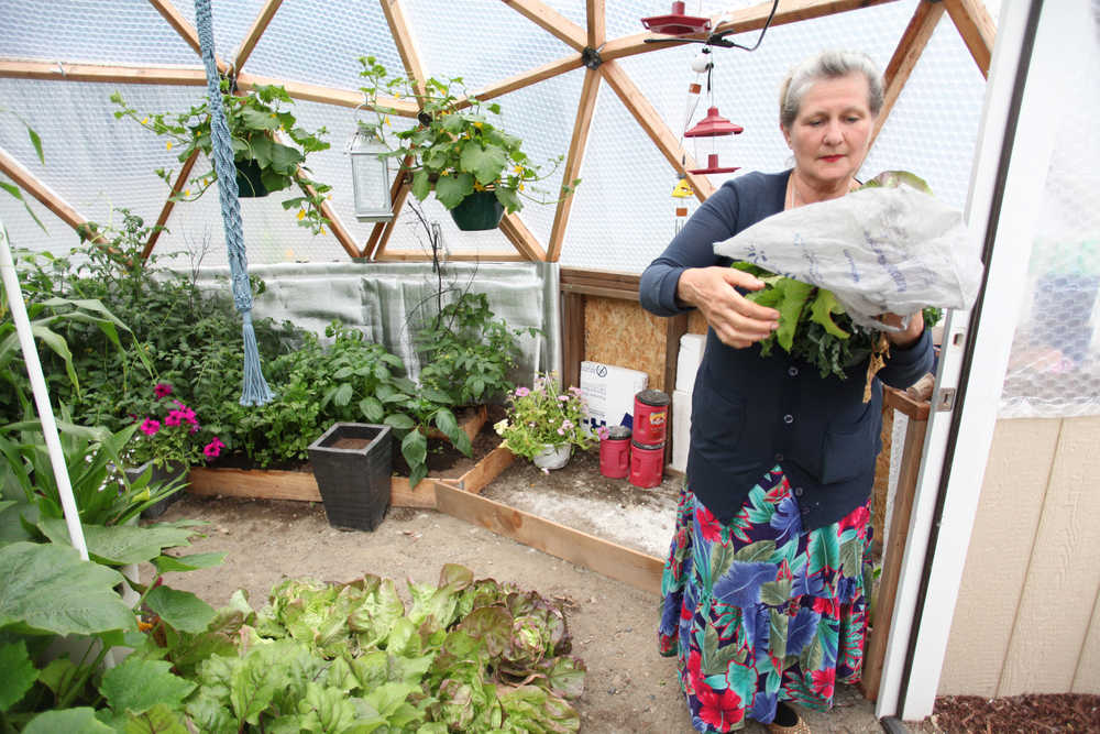 Photo by Kelly Sullivan/ Peninsula Clarion Lark Ticen bags up some fresh greens Monday, July 6, 2015, inside her arctic dome in Kenai, Alaska. She said she has been eating out of her "little, big" garden for 2.5 months. The corn she plans to harvest in August was taller then her own height, much more than the "knee-high by the fourth of July," requirement corn growers in the Lower 48 believe the stalks have to be to know if a good crop will come in during the season.
