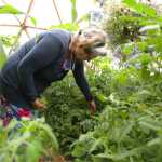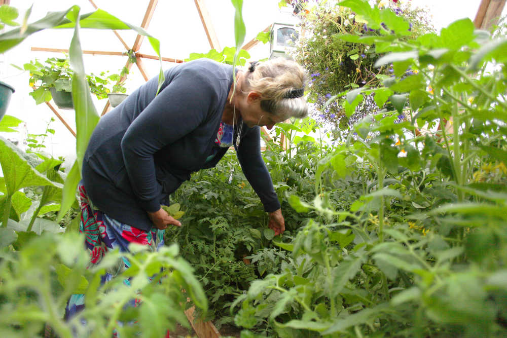 Photo by Kelly Sullivan/ Peninsula Clarion Lark Ticen sifts through tomato vines looking for ripe fruit Monday, July 6, 2015, inside her arctic dome in Kenai, Alaska. She said she has been eating out of her "little, big" garden for 2.5 months. The corn she plans to harvest in August was taller then her own height, much more than the "knee-high by the fourth of July," requirement corn growers in the Lower 48 believe the stalks have to be to know if a good crop will come in during the season.