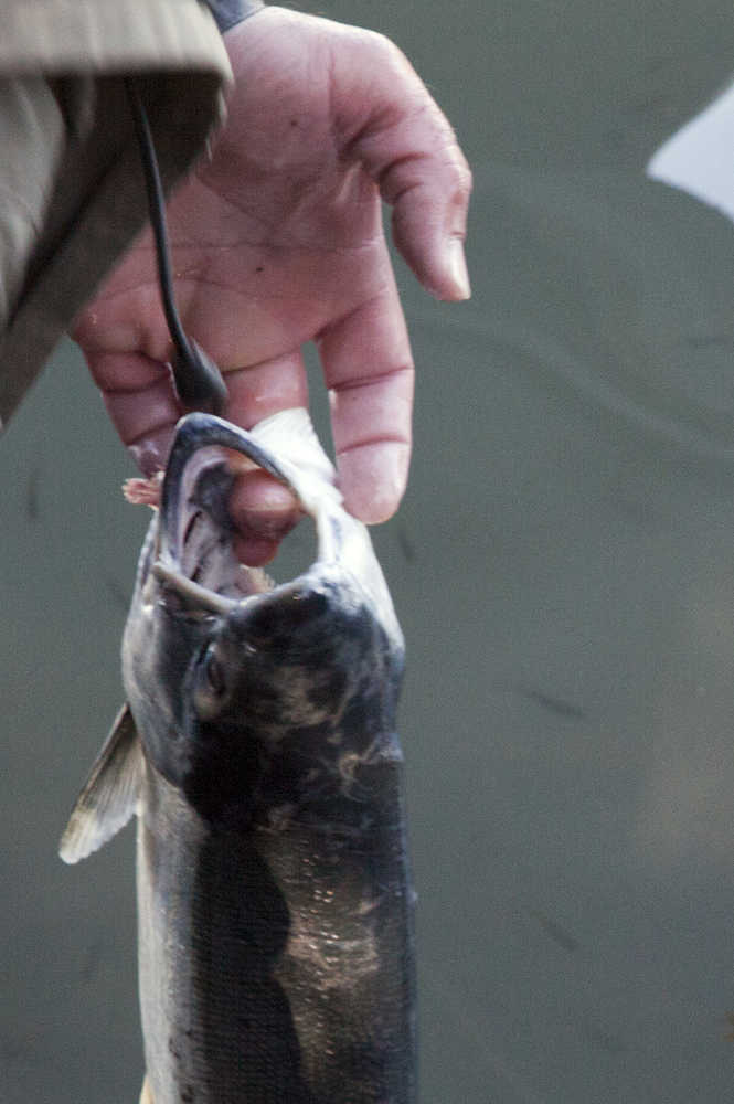 Photo by Rashah McChesney/Peninsula Clarion  A sockeye salmon dangles over a group of smolt in the Kenai River on Wednesday July 14, 2015 in Funny River, Alaska.