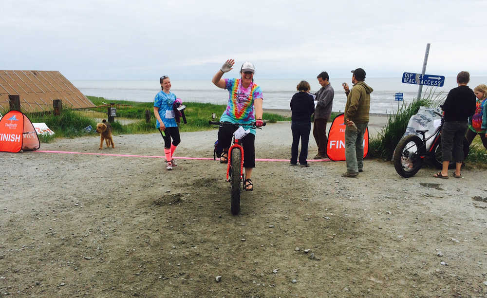 The 2nd fat tire race from the mouth of the Kenai River down the Cook Inlet beach to the mouth of the Kasilof was held Sunday, June 21st to promote clean water and healthy salmon in Cook Inlet. The idea of outdoor enthusiasts Kaitlin Vadla and Mike Crawford last year’s inaugural event had a healthy turn out. “It’s all about celebrating the wild in all of us and our wild rivers and salmon that we love so much and want to preserve as our legacy,” said Vadla. “The tide was low and spirits where high for this year’s Mouth to Mouth wild run and ride! 58 runners, fat bikers, horseback riders and their canine friends raced down the beach during the longest day of the year. Sponsored by Cook Inlet keeper, Tsalteshi Trails, Kenai Watershed Forum, Kenaitze Indian Tribe, & Kenai Peninsula Chapter Trout Unlimited, the community event celebrates wild healthy rivers, salmon and people in the Cook Inlet region. KDLL public radio DJs played tunes for finishers, local food trucks Beck’s Day 2 Day Gourmet and Cut the Cheese refueled hungry racers. Many participants celebrated at the finish line with cold beers from Kenai River Brewery and cookies from Odie’s Deli. Thanks to prize sponsors Raven Glass Works, Wilderness Way, Sportsmen’s Warehouse, and Homer Cycling Club. Thanks to all volunteers and participants,” said Vadla.