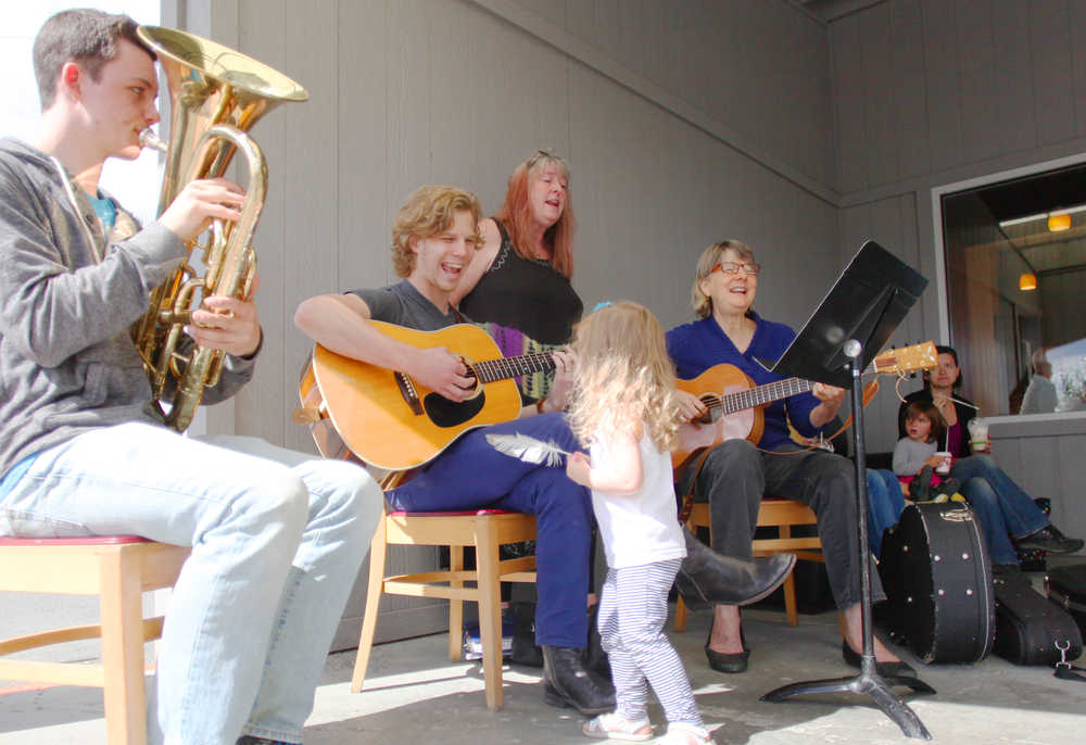Photo by Kelly Sullivan/ Peninsula Clarion Petra Mayer approaches her father Garrett Mayer during his performance during the Kenai Peninsula Orchestra's Summer Music Festival Monday, July 27, 2015, in Soldotna, Alaska. Players shifted throughout the performance due to a miscommunication. The main musicians including Mayer, Jack Will, Sue Biggs and Logan Boyle, dubbed themselves the Professors Blackstone's Impromptu Wizards. "They just were thrown together last minute, and listen- they are amazing," said music festival's Artisit Director Tammy Vollom-Matturno.