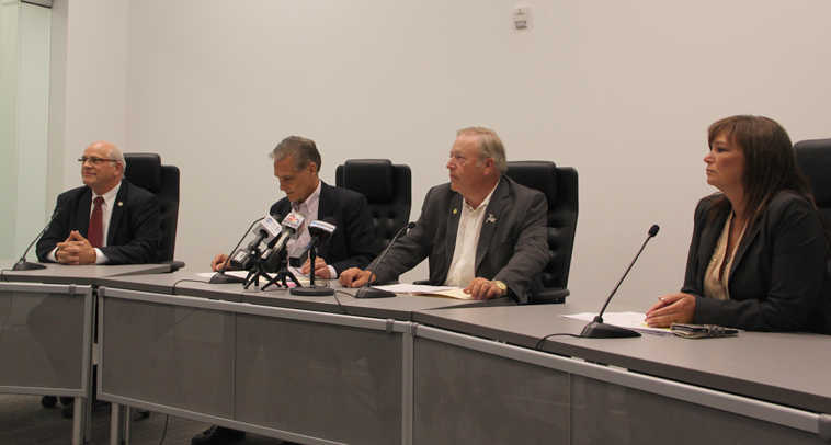Photo by Elwood Brehmer/Alaska Journal of Commerce Sens. John Coghill and Kevin Meyer, House Speaker Mike Chenault and Rep. Charisse Millett appear at a press conference in Anchorage Tuesday.