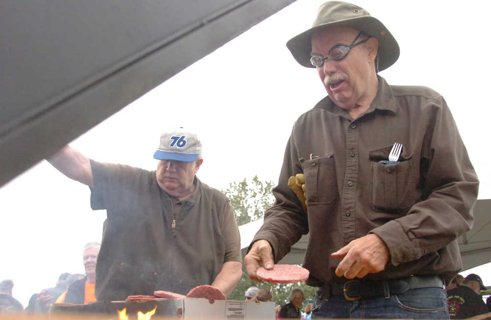 Ben Boettger/Peninsula Clarion Wearing swim goggles to protect his eyes from smoke, Bill Switzer tosses burger patties on a grill with the help of Larry Nudson (background) during Kenai's Industry Appreciation Days on Saturday, August 29 at the Kenai Park Strip.