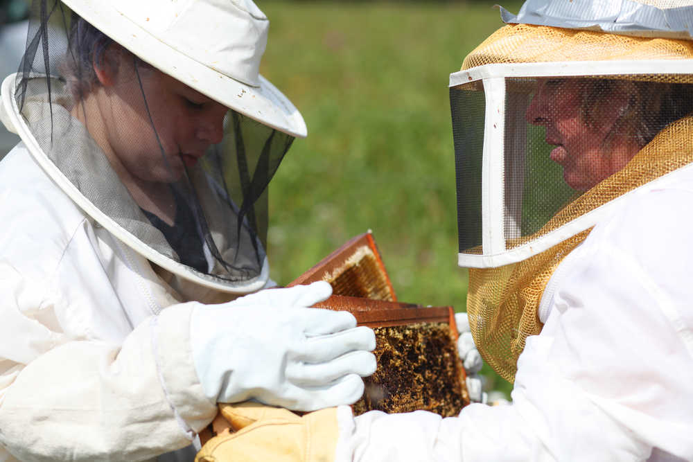 Photo by Kelly Sullivan/ Peninsula Clarion Jeremy Souders helps his mother Sarah Souders switch hive frames Thursday, August 6, 2015, in Kenai, Alaska.