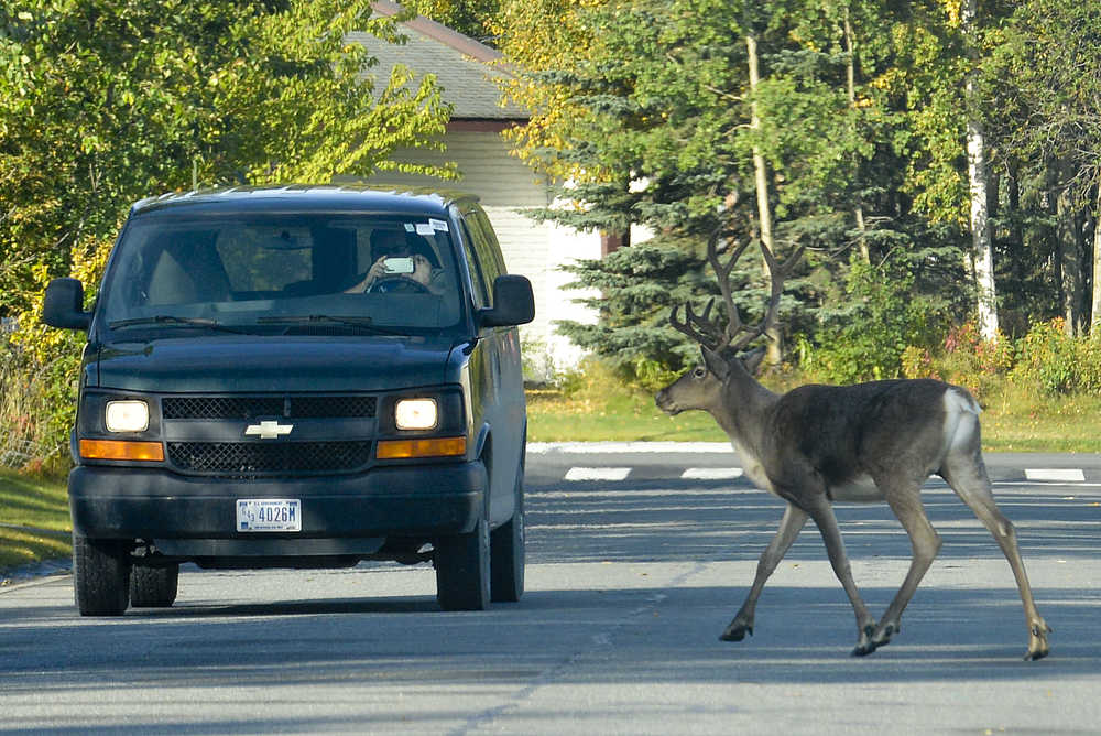 Photo by Rashah McChesney/Peninsula Clarion A caribou runs through neighborhood near Binkley Street on Thursday Sept. 10, 2015 in Soldotna, Alaska.