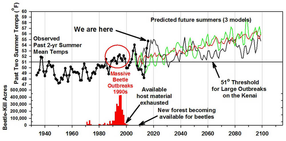 Spruce bark beetles thrive on runs of warm summers, and the present 3-year run of sunny summers should trigger another burst of beetle activity. My research as an ecologist at the Kenai National Wildlife Refuge during the 1990s focused on the history and causes of bark beetle outbreaks. Using tree-ring analysis (dendrochronology), my colleagues and I developed a 250-year record of bark beetle outbreaks all around Cook Inlet. The last major outbreak was in the 1880s when many stands on the Kenai and in Katmai and Lake Clark National Parks were heavily thinned, similar to the 1990s. There were smaller regional outbreaks in the 1970s, 1910s, 1850s and 1810s, as well as local outbreaks at other times.