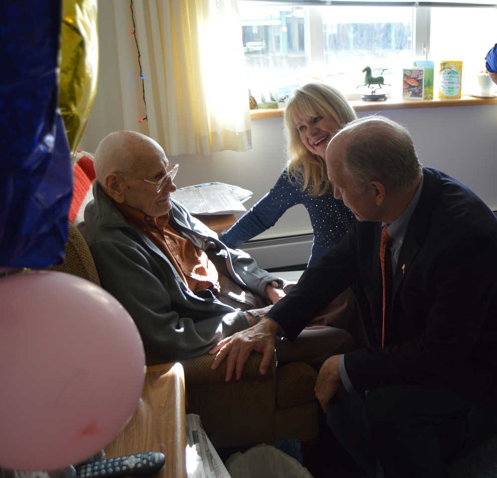 Gov. Bill and First Lady Donna Walker visit with Wendell Stout, at Homer's Friendship Terrace on Friday. Stout celebrated his 100th birthday Sept. 27. The Walkers were in Homer for the Southern Peninsula Senior Summit and the awards banquet of the Alaska Recreation and Park Association.