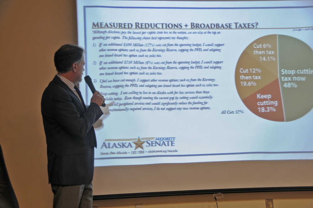 At his annual legislative update Wednesday night at the Kenai Peninsula College’s Kenai River campus, the District O state senator presented the state’s dismal fiscal picture and a slew of options for new revenue. With a nearly $3 billion general fund gap, cutting more will take away many state services, an option he doesn’t want to consider, he said.