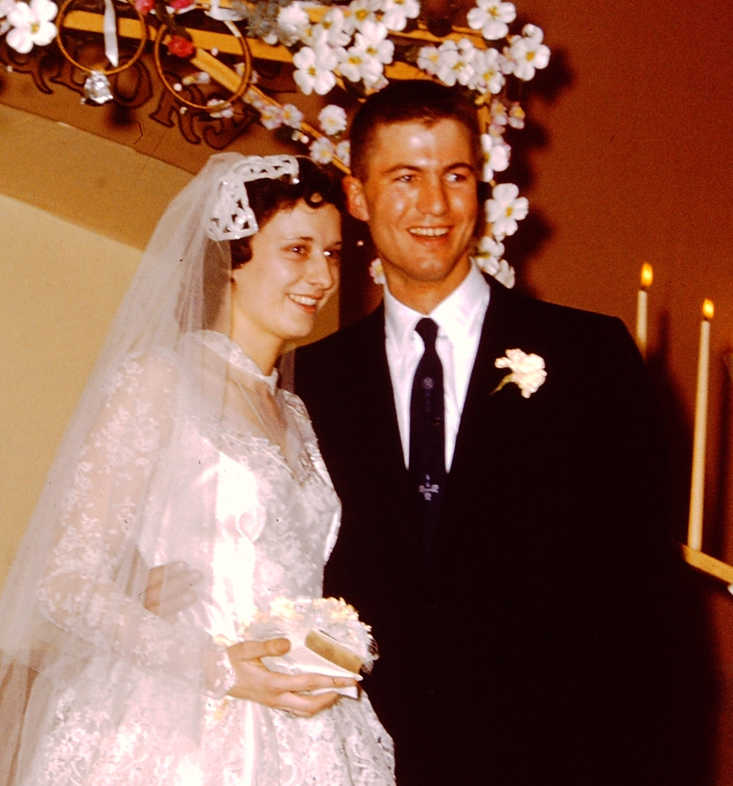 Jim drove from Anchorage (he was in the Army) to Valdez with the wedding cake in a blinding snow storm. It snowed 4 feet in less then 24 hours. After getting married they were stranded in Valdez because of the 50 feet of snow closing Thompson Pass. They spent their honeymoon on the couch in the living room of Betty’s parent’s trailer. They had to support the roof and walls with 2-by-4’s as the walls were flexing in with the wind. Jim was AWOL since it took them 6 days before the road was opened so he could get back to boot camp in Anchorage.