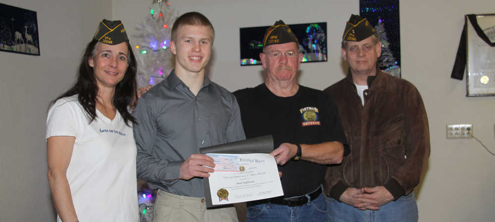 Local winners of this year’s Voice of Democracy (VOD) were honored at VFW Post # 10046 at a special presentation December 8th. This year’s VOD prompt for high school students was “My Vision for America.” Shania Johnson, a junior at Cook Inlet Academy was the second place winner of a $500 cash award. “For me it was an opportunity to give my opinion of what I thought was going to be the future of America from a positive as well as a negative viewpoint. Going forward I believe we need to look back at the documents given us by our founding fathers, not only the Constitution but the Bill of Rights and the Declaration of Independence because they are there to correct us when we get off track,” she said. Taking 1st Place and winning $1,000 cash from the VFW was Paul Steffensen, a junior in the KPBSD Connections home school program. “My vision for America means striving to be the best we can be and to do that we must look to the examples that our veterans have given us. Many people need an example to follow and veterans are a great example for my generation to follow. My grandfather was a WWII veteran and he was a huge role model for me growing up. He was a building block for who I wanted to become as a person,” said Steffensen in an interview.