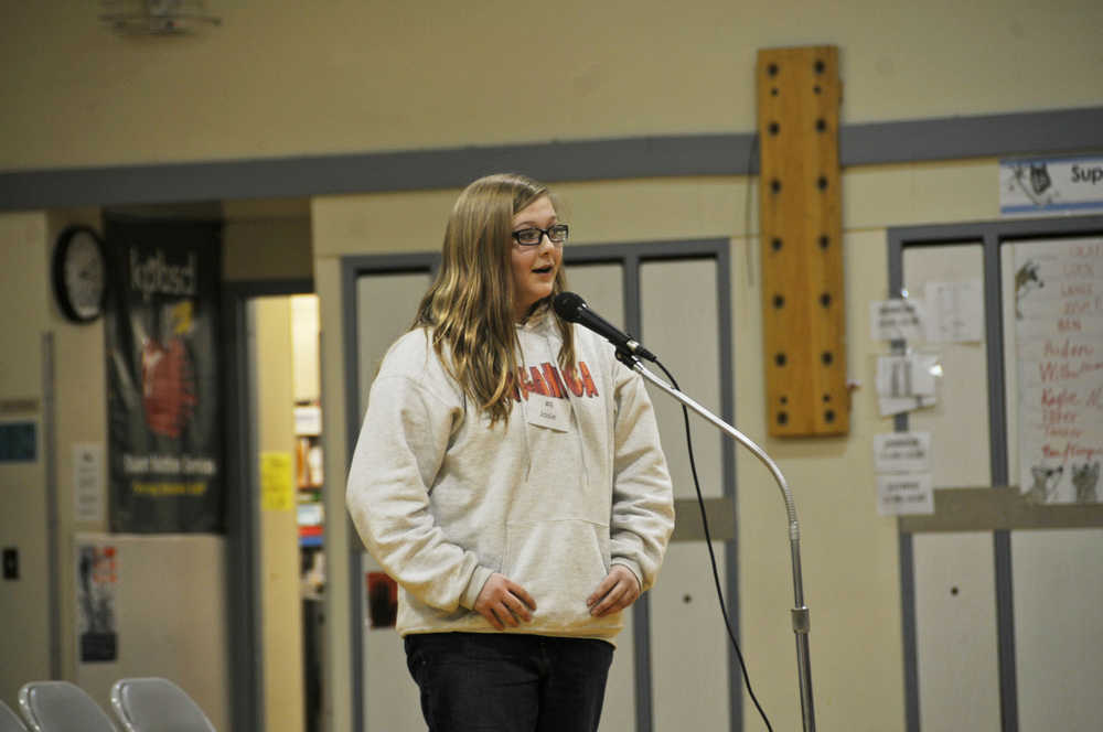 Photo by Elizabeth Earl/Peninsula Clarion Josie Moore, a sixth-grader at Soldotna Elementary School, took first place at the school's spelling bee Wednesday. Moore, who also won last year, will go on to the state spelling bee in Anchorage to compete.