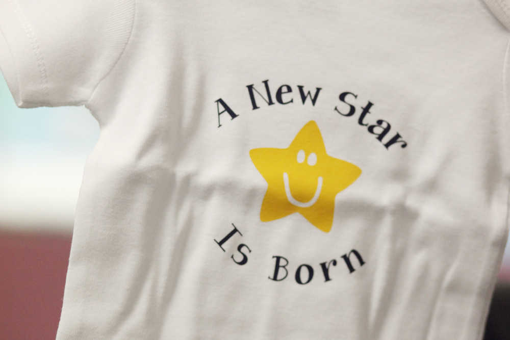 Photo by Kelly Sullivan/ Peninsula Clarion Nikiski North Star Elementary School teacher Gina Ellis designed the onsies that go to the school's growing families Wednesday, Feb. 24, 2016, at the school in Nikiski, Alaska.