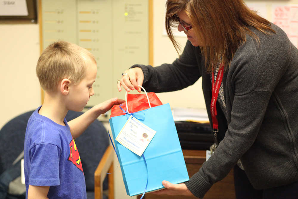 Photo by Kelly Sullivan/ Peninsula Clarion Principal Margaret Gilman hands first grader Regan Savly one of the Baby Baskets that staff and students put together to welcome the newest additions to the Nikiski North Star Elementary School community Wednesday, Feb. 24, 2016, at the school in Nikiski, Alaska.