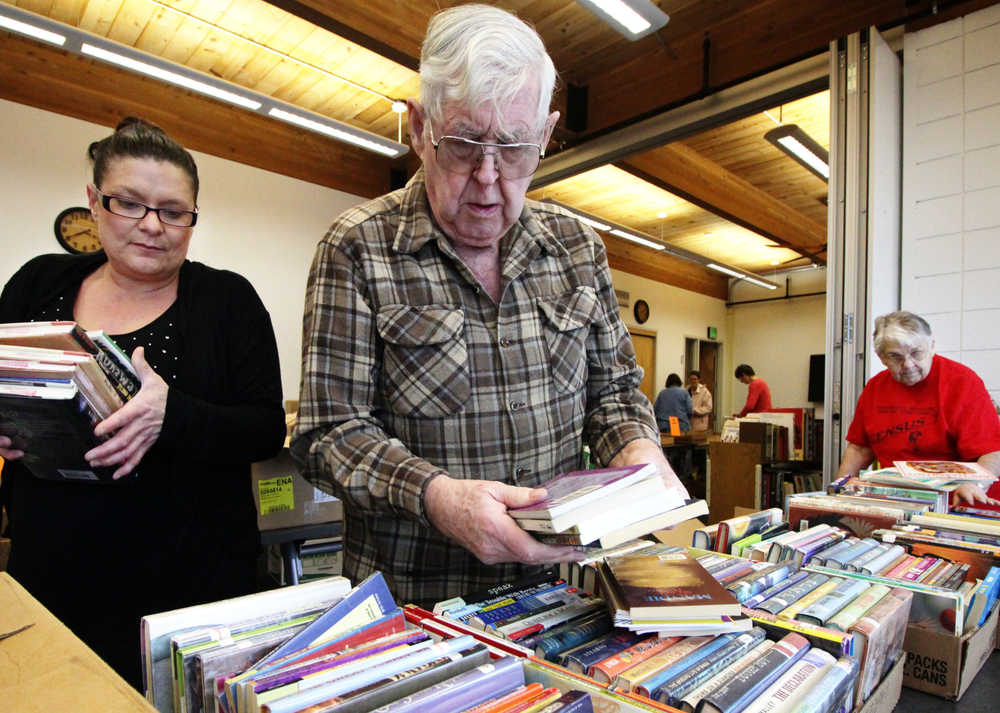 Members of the Friends of Kenai Library arrange books in preparation for their fundraising book sale on Saturday, March 5 at the Kenai Community Library's conference room. The group will sell donated books to benefit the library from March 7 to the 13th.