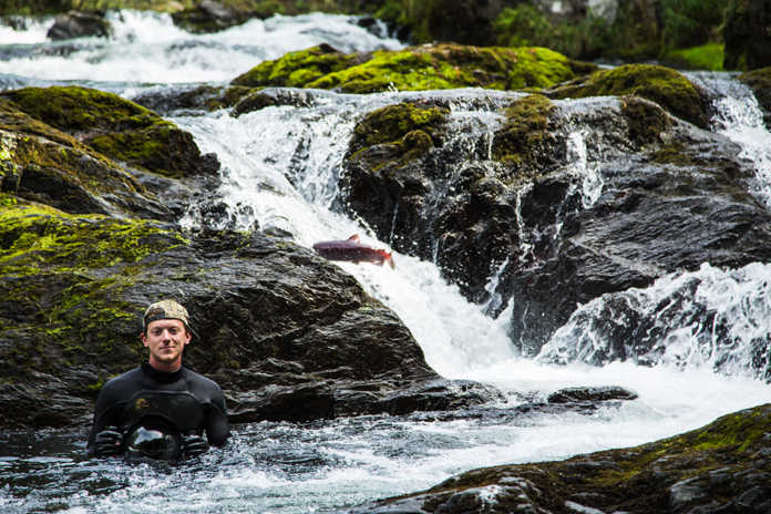 People standing at the base of Russian River Falls, with sockeye swirling around in the clear water, are usually equipped with fishing poles. Buck Kunz jumps in with a waterproof camera.