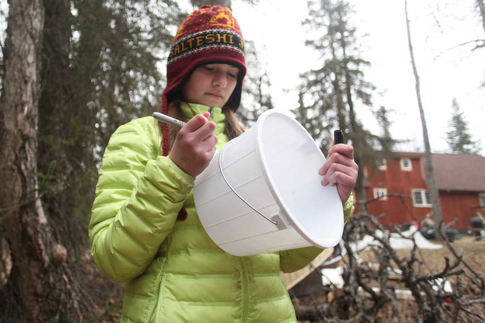 Every evening after work he and his daughter Amelia Mueller, a sixth-grader at Kenai Middle School, gather what has fallen into the white pails resting on nails stuck in rough bark.