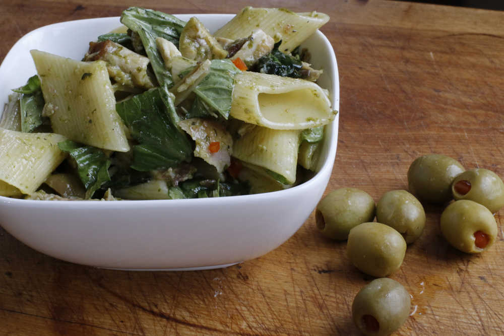 In a large bowl combine the cooked ramps, cooked and cooled pasta, vinaigrette, chicken, olives and basil. Toss well to combine thoroughly.