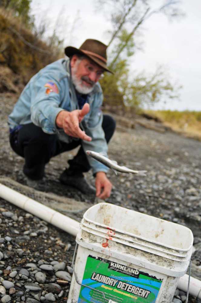 Photo by Elizabeth Earl/Peninsula Clarion Jon Harmon of Nikiski disentangles hooligan from a gillnet on the banks of the Kenai River on Tuesday, May 10, 2016 in Kenai, Alaska. The personal use fishery for hooligan on the Kenai River is open from April 1 to June 15 of each year.