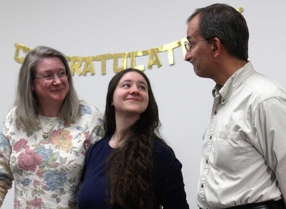 Deborah Glick (center) stands between her parents during the IDEA Homeschool group's celebration of its 2016 graduates on Friday, May 13 in Soldotna.