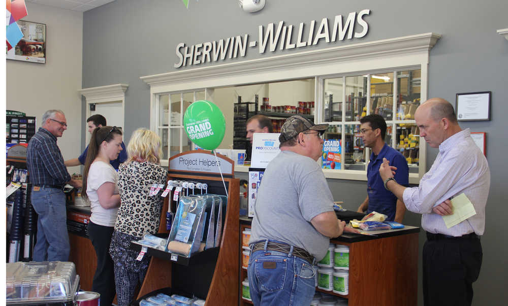 The beautiful new Sherwin Williams paint store held their grand opening Saturday, May 14th with huge discounts and valuable door prizes. The paved parking lot and landscaped perimeter pleased customers as they lined up for consultations and free food. Formerly Columbia Paint store, which was well known for personal service and customer care Sherwin Williams bought the while at its former location next to Sweeney’s Clothing in Soldotna. “It’s been a great day exceeding our expectations with constant traffic and a huge acceptance from the community. Sure paints are available at the big mega stores, but people buy from people so we have worked hard to make this new store a friendly warm atmosphere with the additional touch of a hometown company that is here to help our customers get the best product at the lowest prices. We appreciate the community and we appreciate being here in this new facility,” Rich Younts, district manager for Sherwin Williams who was present at the grand opening and talking personally with customers.